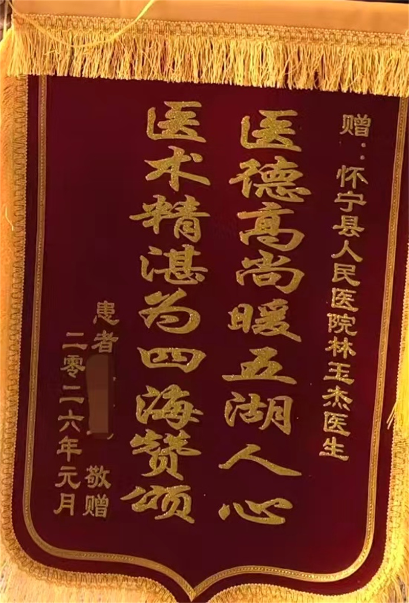 近日,怀宁县人民医院康复医学科门诊上演温馨一幕:一位被病痛困扰多年的患者,将一面写有“医德高尚暖五湖人心 医术精湛为四海赞颂”的锦旗送到林玉杰医生手中,以此感谢医生帮他缓解了长达七八年的顽疾。